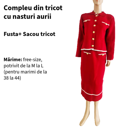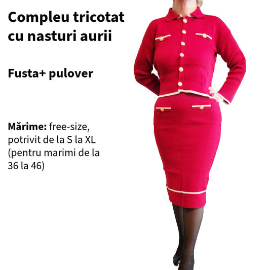 SUPER PROMO 98 LEI! Compleu rosu din tricot cu nasturi aurii - fustă și pulover